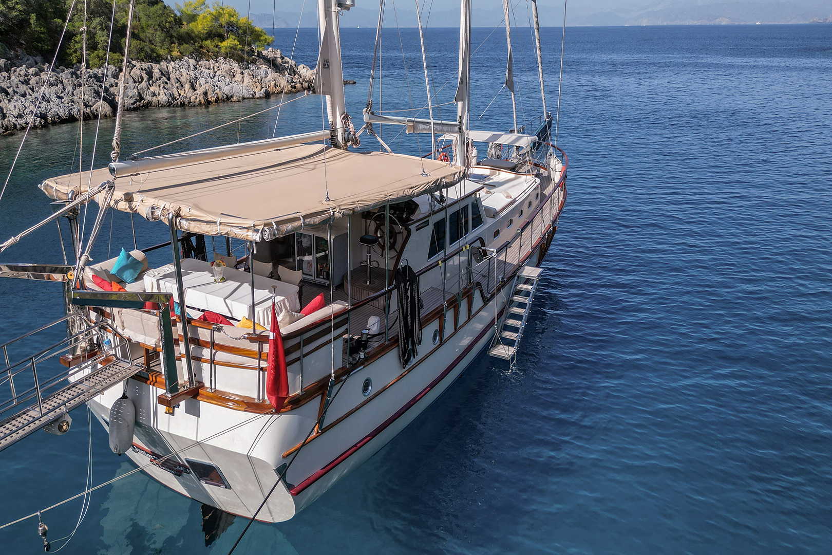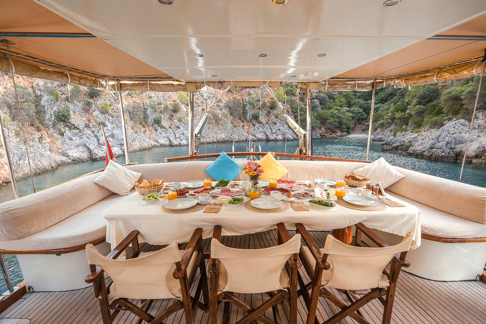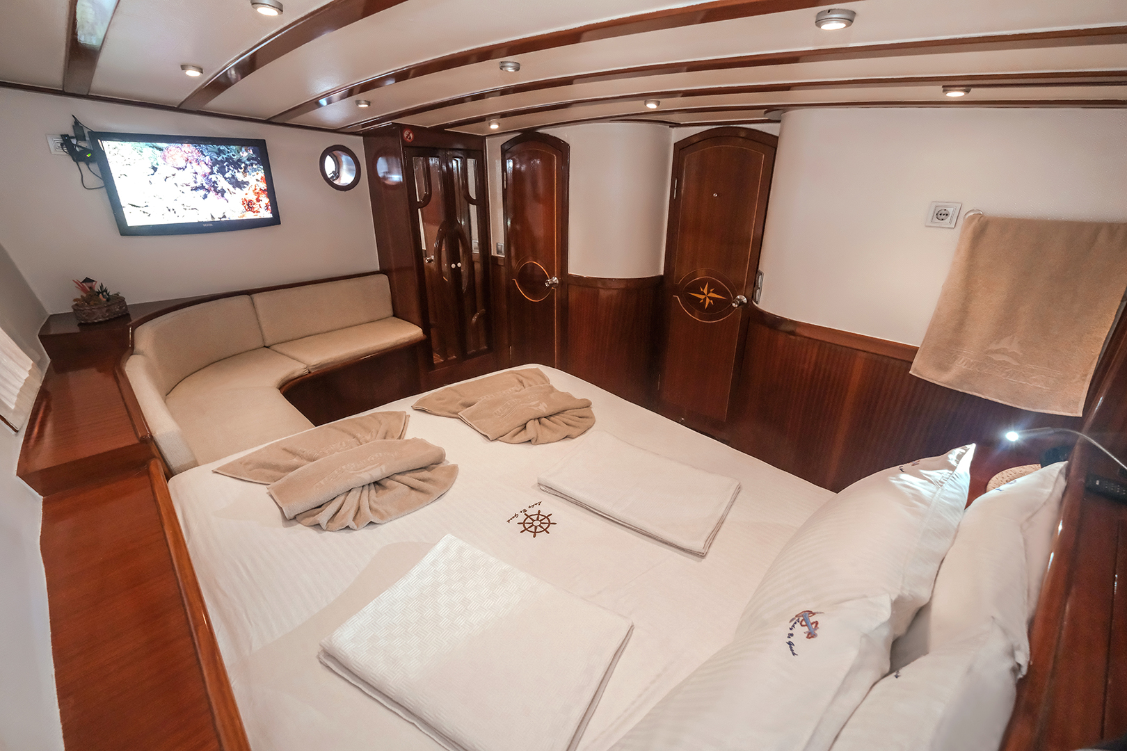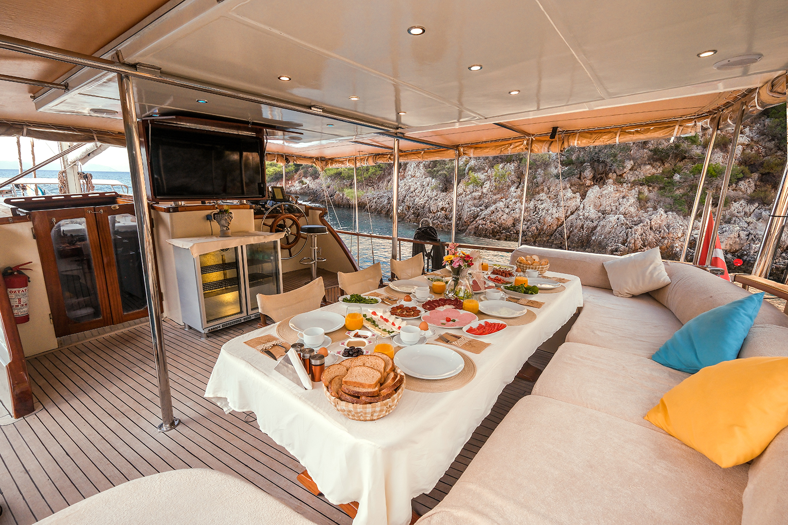 The sunbathing areas and lounge suite on the upper and front decks of our boat allow you to have pleasant moments all day long. The meals prepared in our fully equipped kitchen are carefully served to our guests at the dining tables on the back deck and in the lounge. You can connect to the TV and music system in the lounge with Bluetooth and WI-FI and enjoy music all day long.