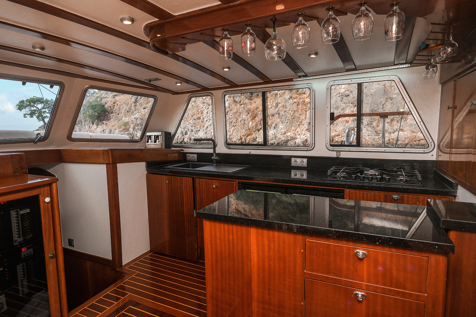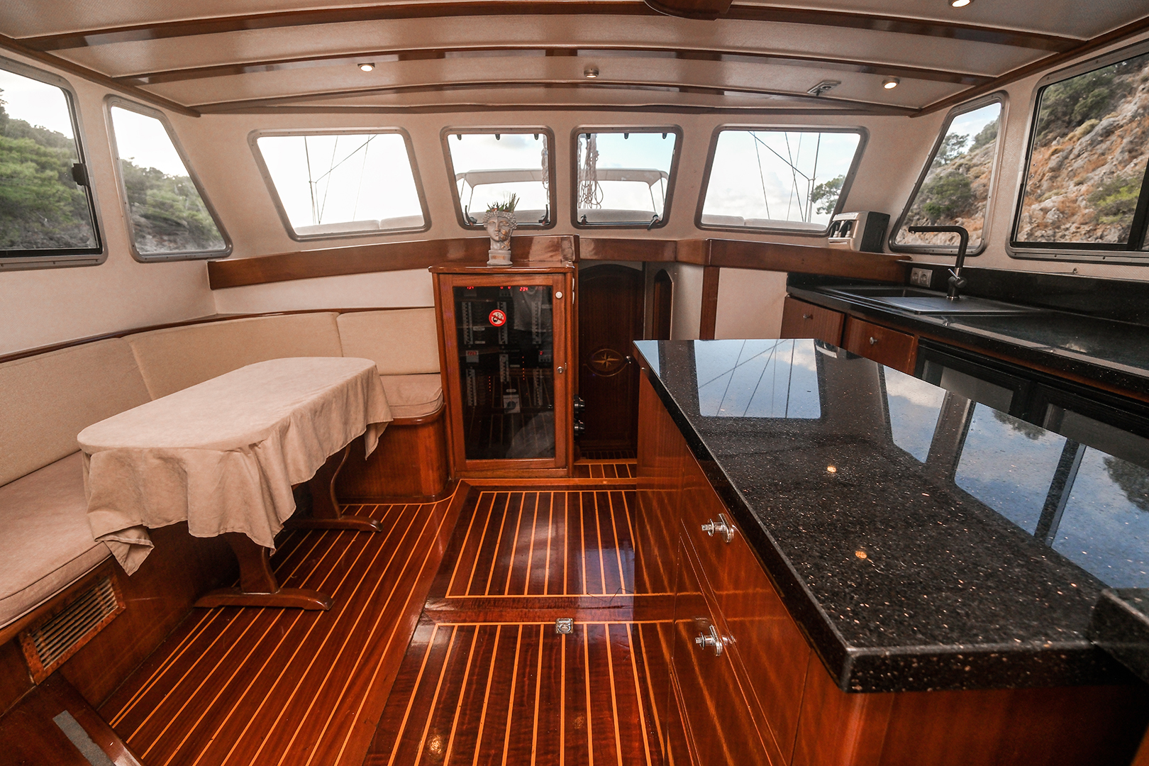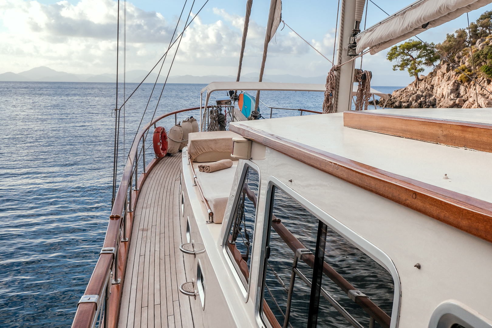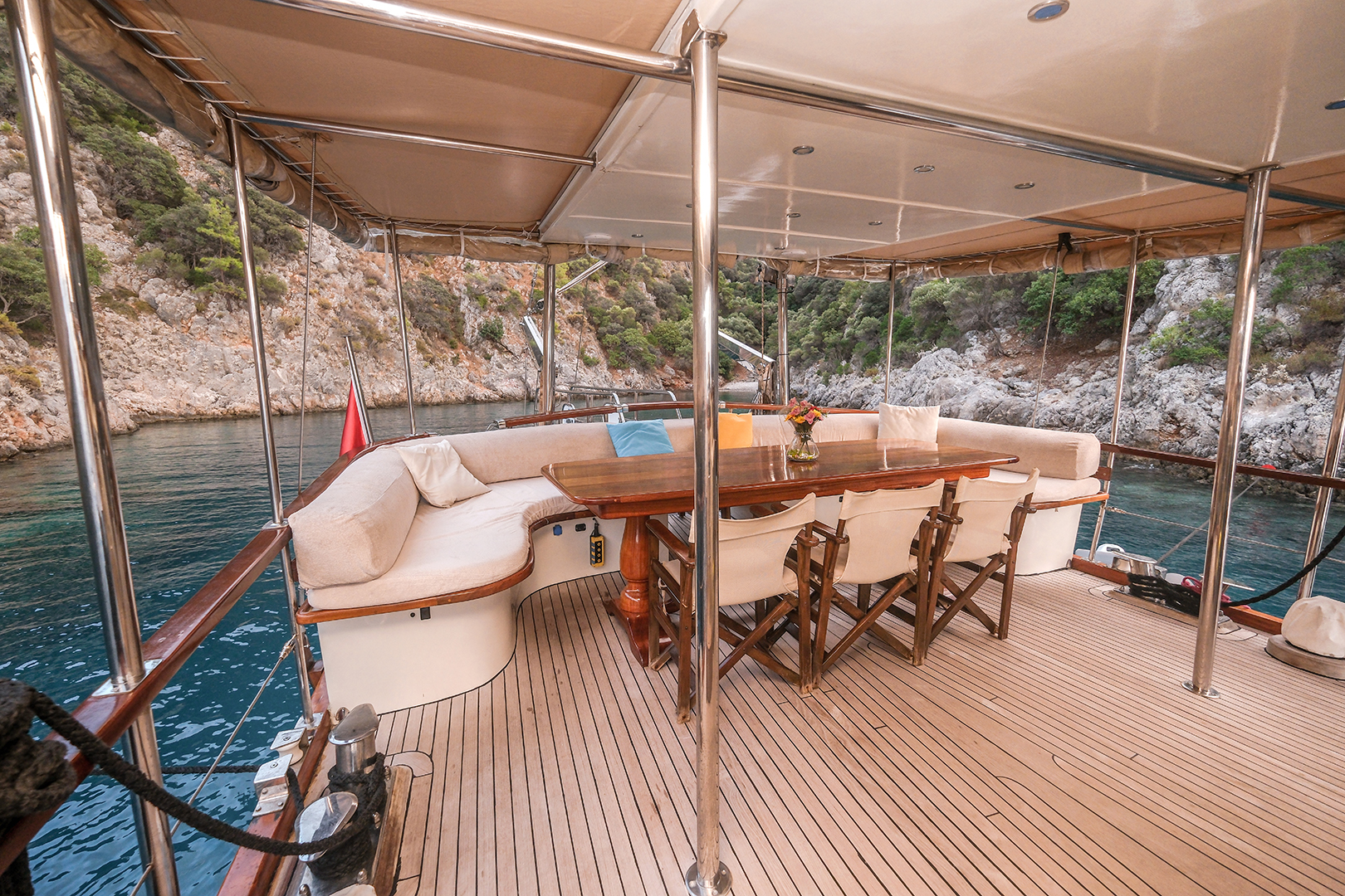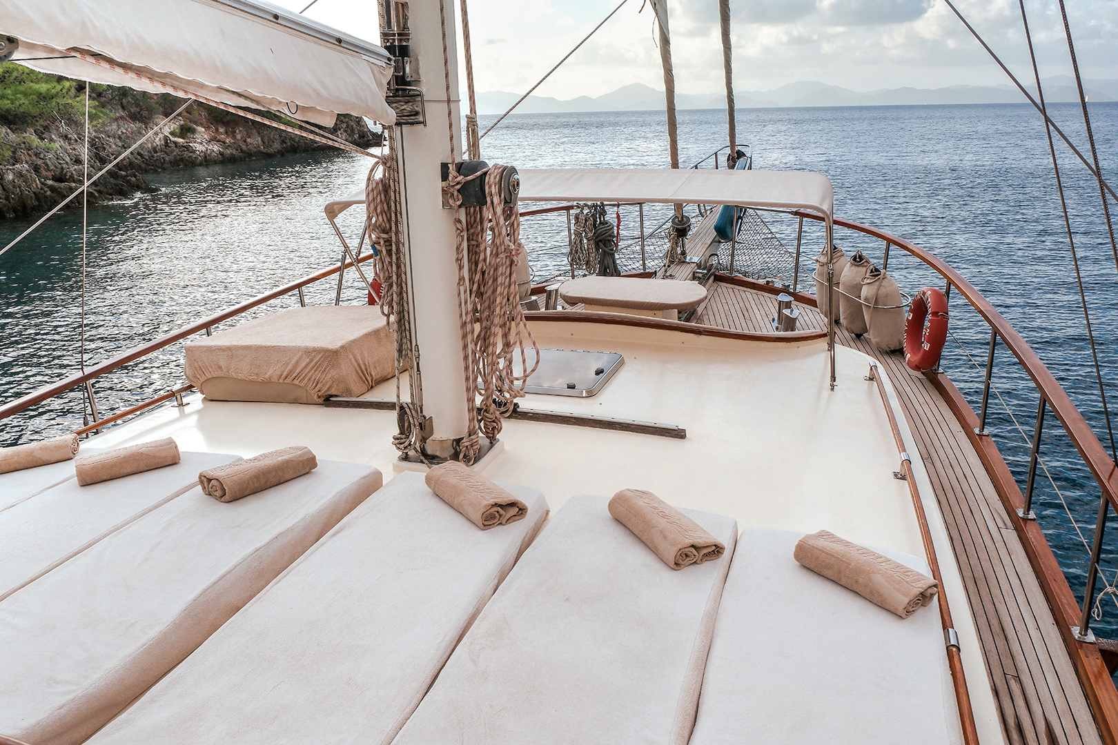 The sunbathing areas and lounge suite on the upper and front decks of our boat allow you to have pleasant moments all day long. The meals prepared in our fully equipped kitchen are carefully served to our guests at the dining tables on the back deck and in the lounge. You can connect to the TV and music system in the lounge with Bluetooth and WI-FI and enjoy music all day long.