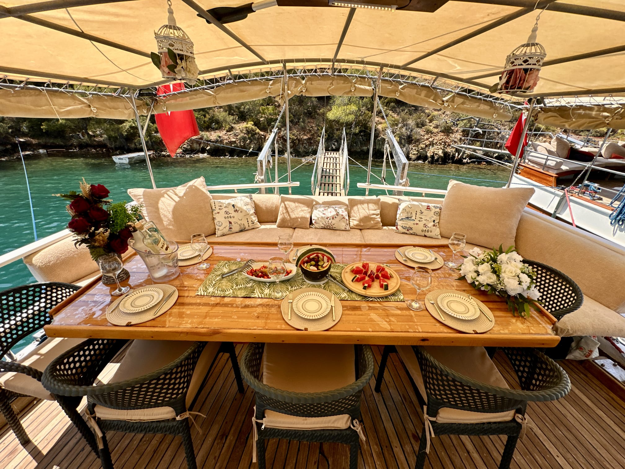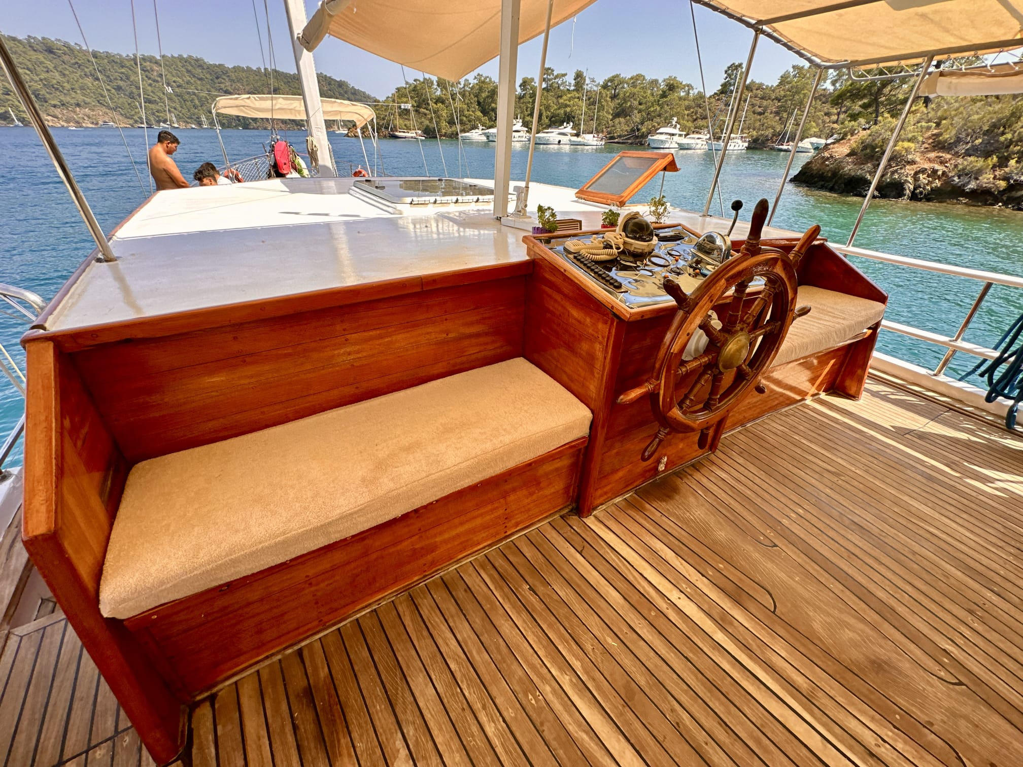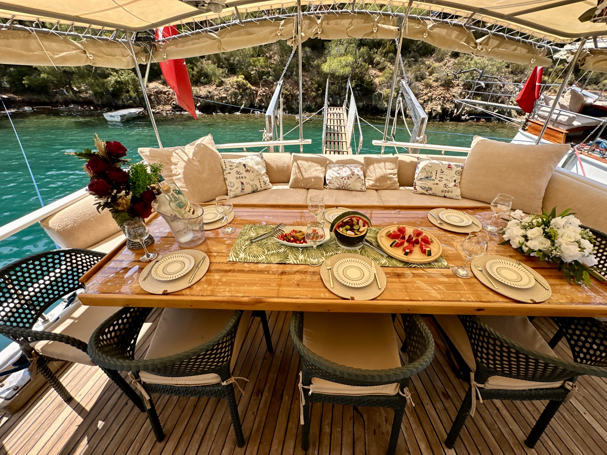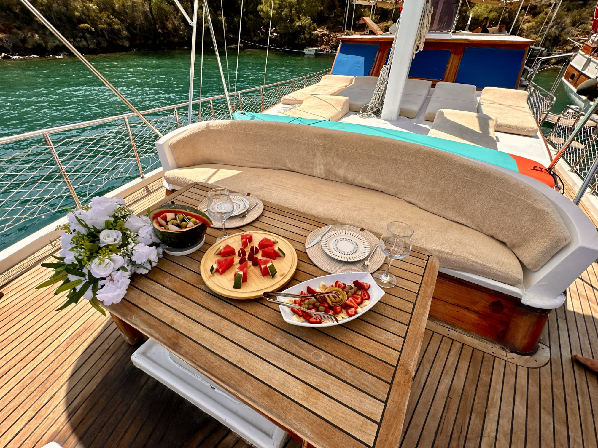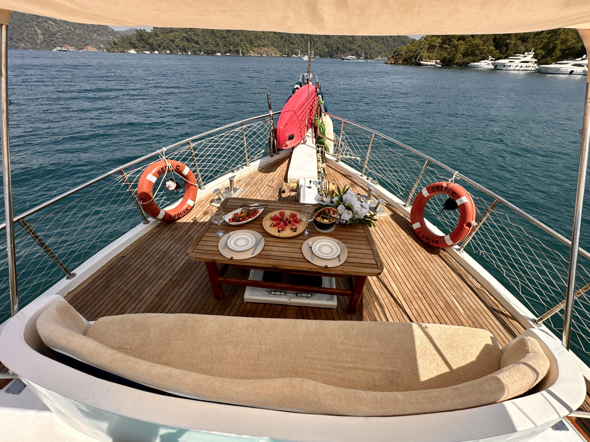 The sunbathing areas and lounge suite on the upper and front decks of our boat allow you to have pleasant moments all day long. The meals prepared in our fully equipped kitchen are carefully served to our guests at the dining tables on the back deck and in the lounge. You can connect to the TV and music system in the lounge with Bluetooth and WI-FI and enjoy music all day long.