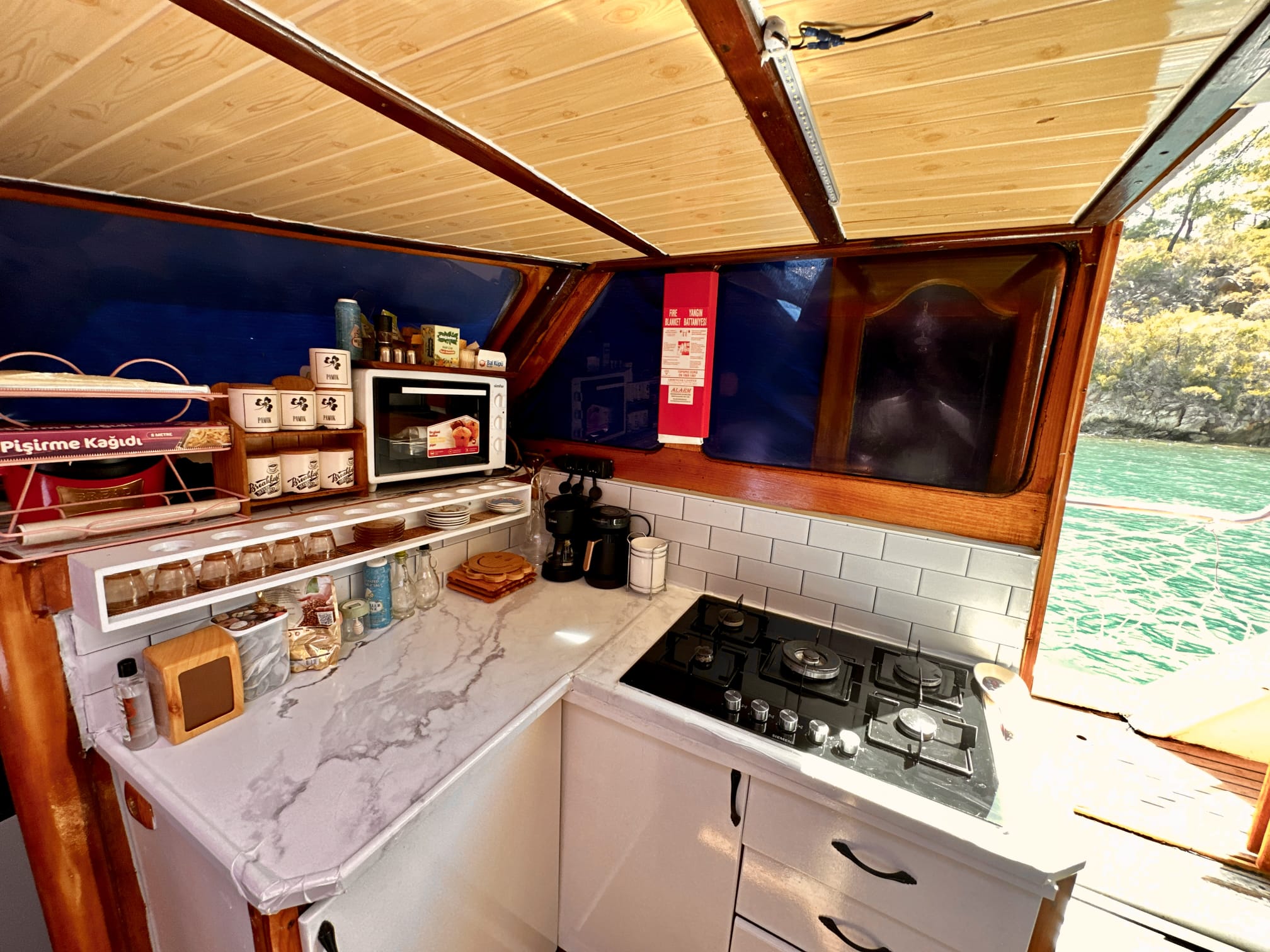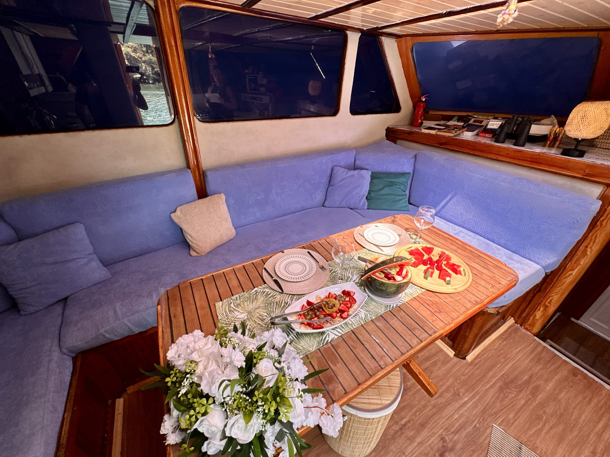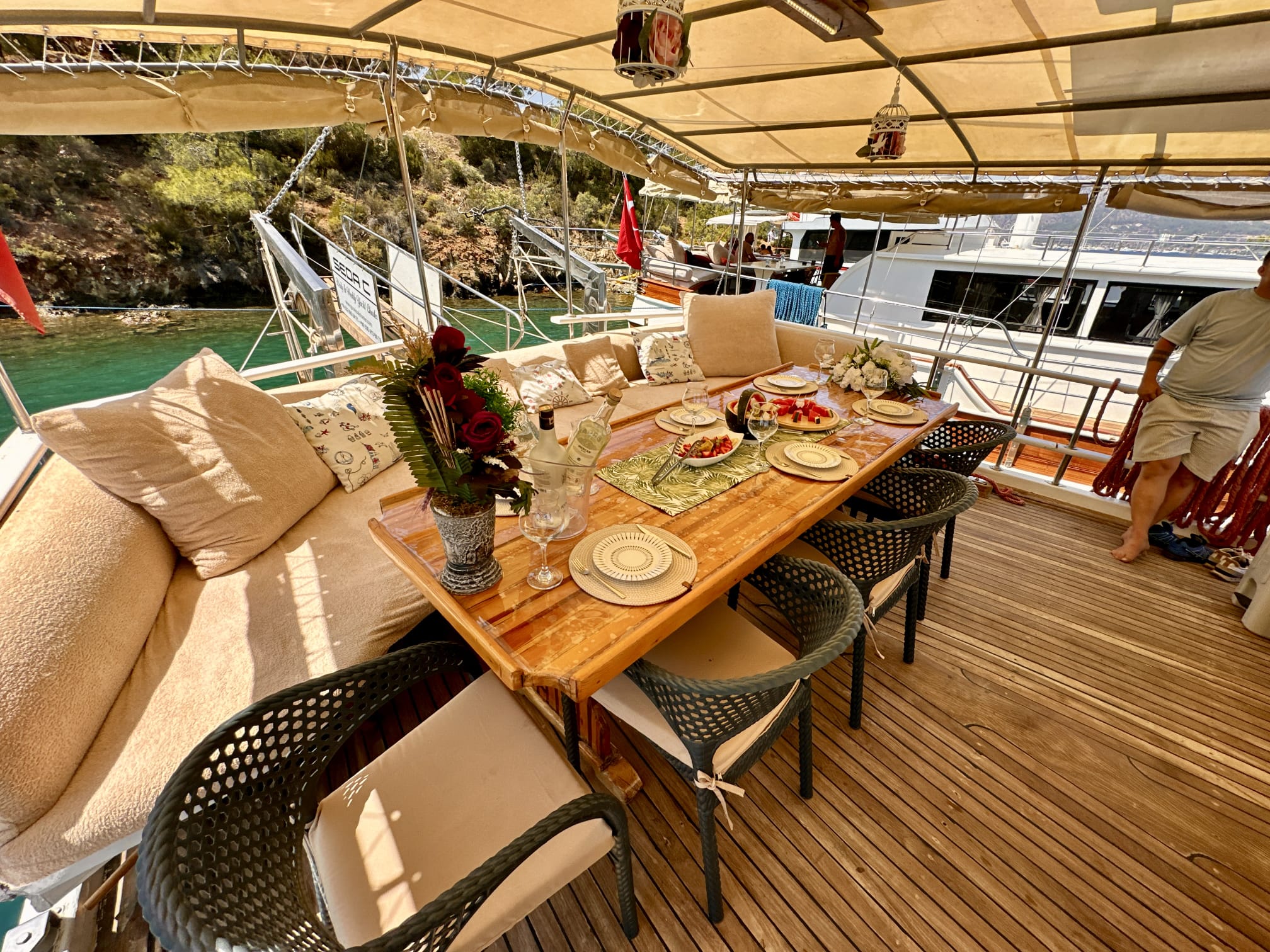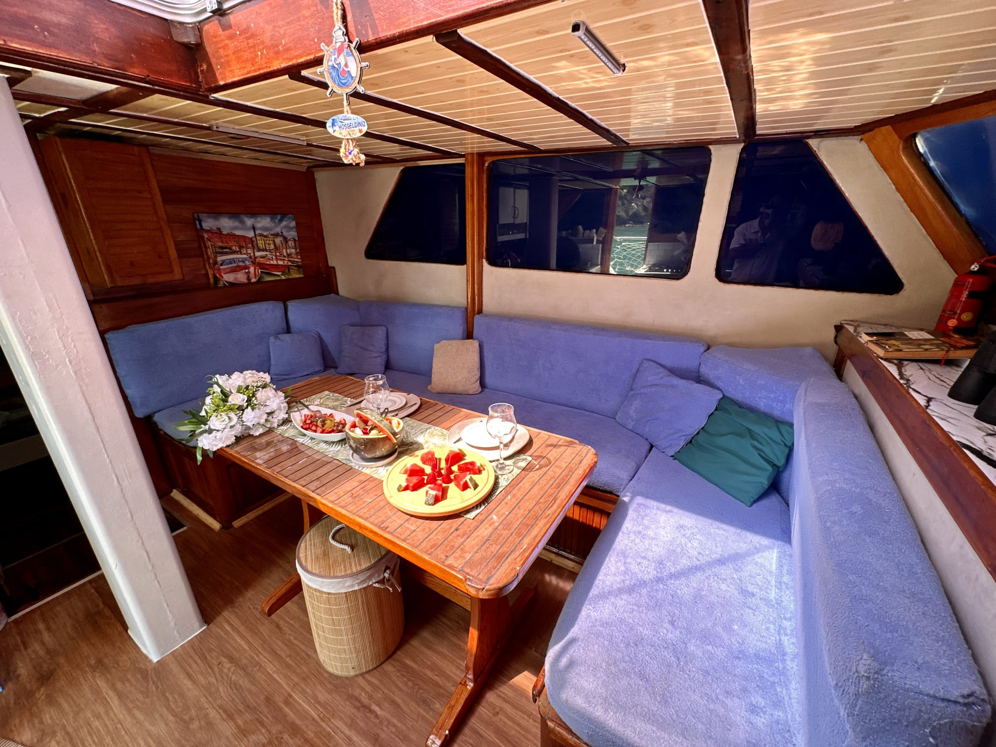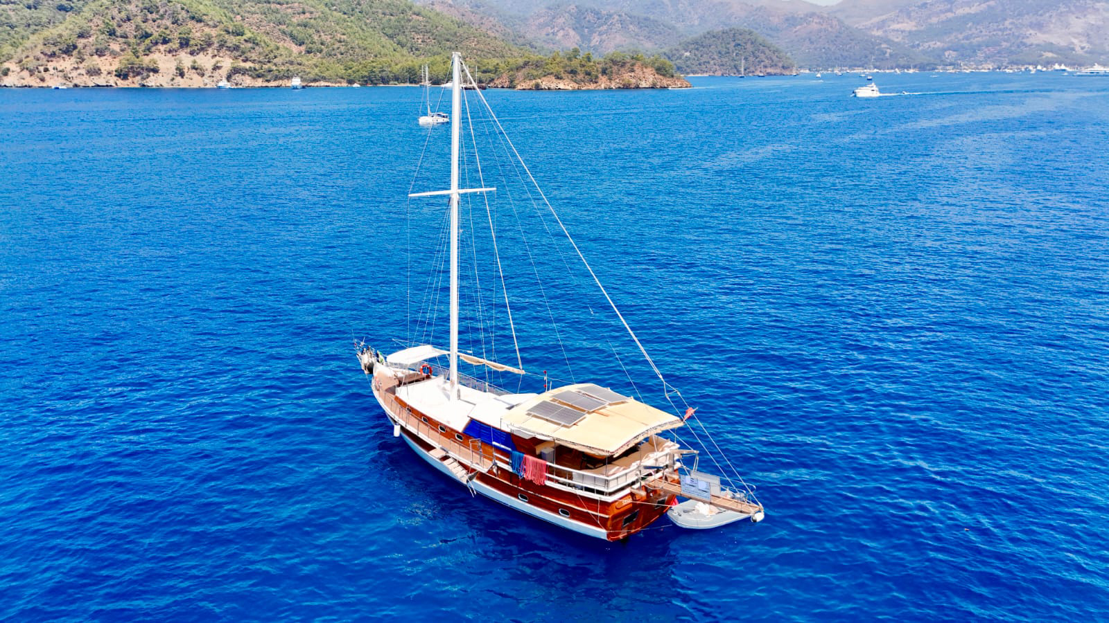 The sunbathing areas and lounge suite on the upper and front decks of our boat allow you to have pleasant moments all day long. The meals prepared in our fully equipped kitchen are carefully served to our guests at the dining tables on the back deck and in the lounge. You can connect to the TV and music system in the lounge with Bluetooth and WI-FI and enjoy music all day long.
