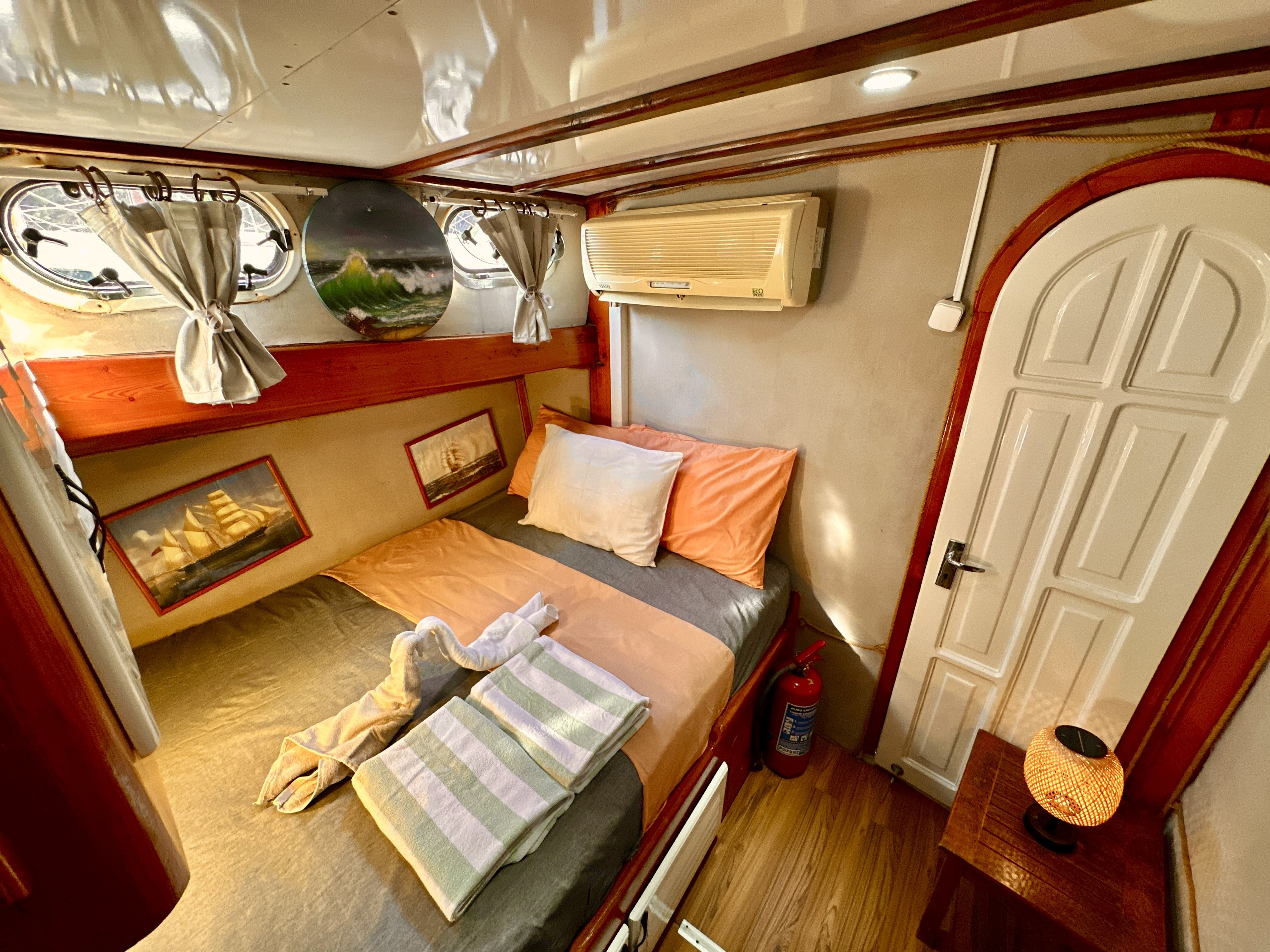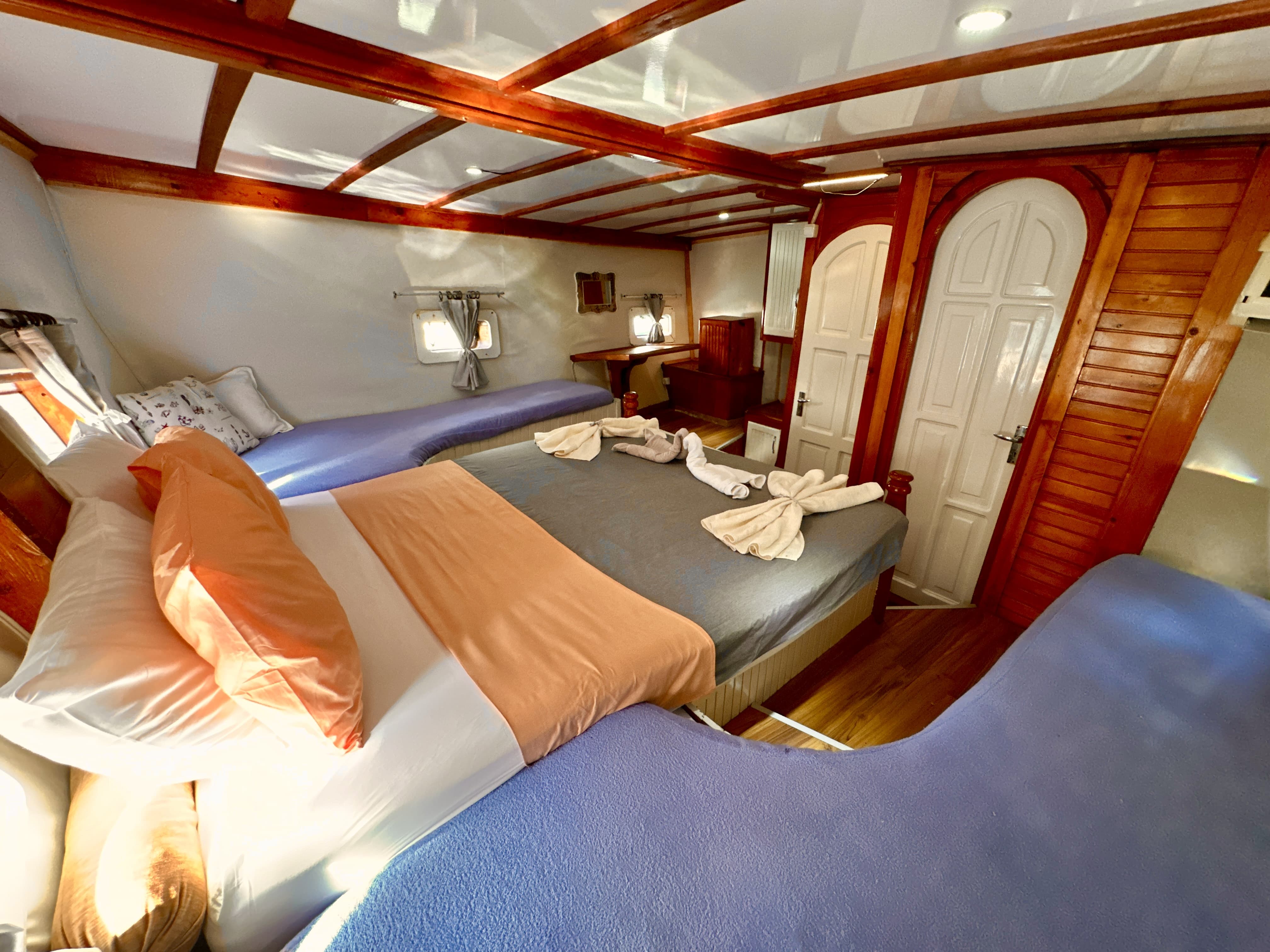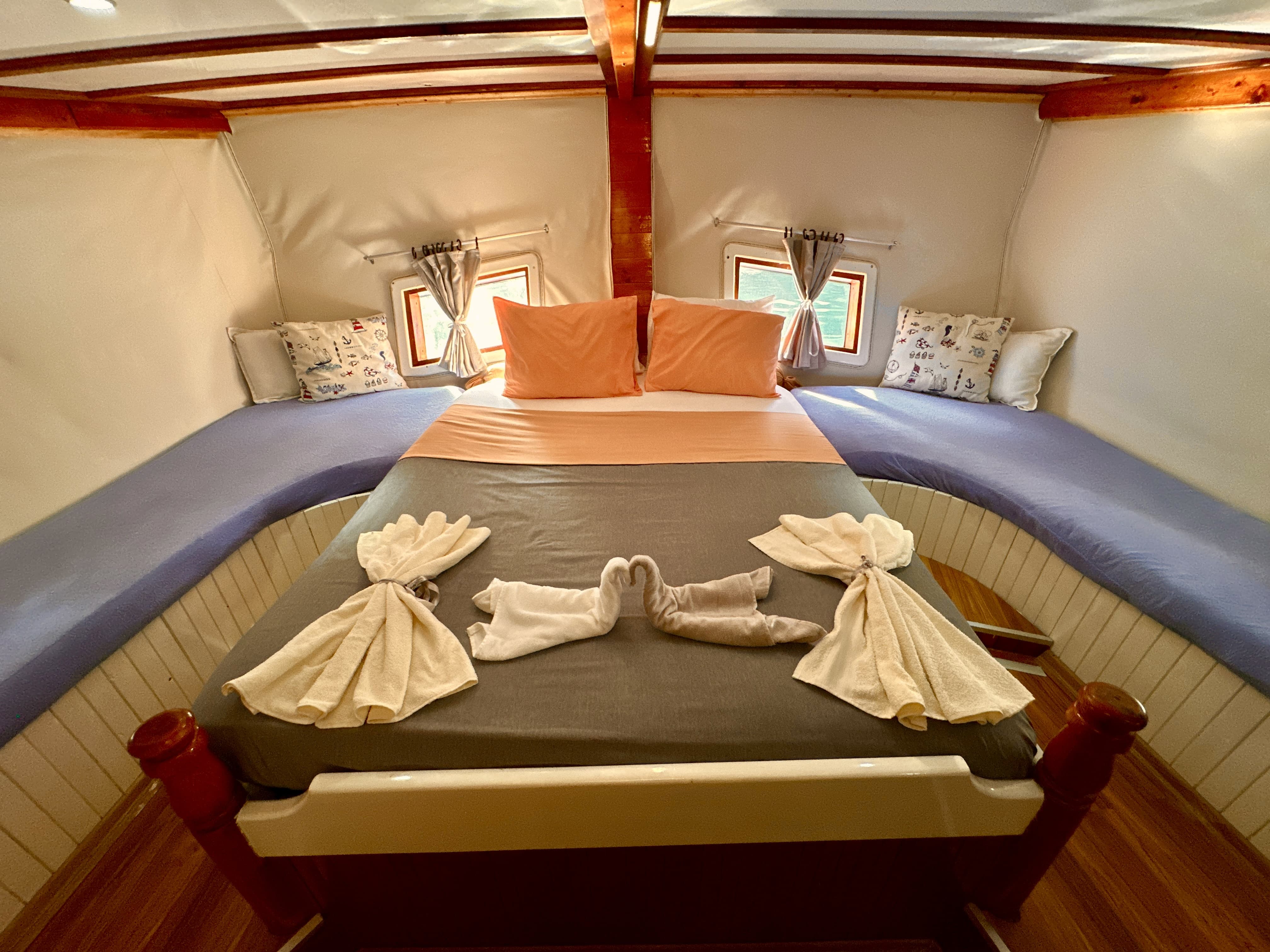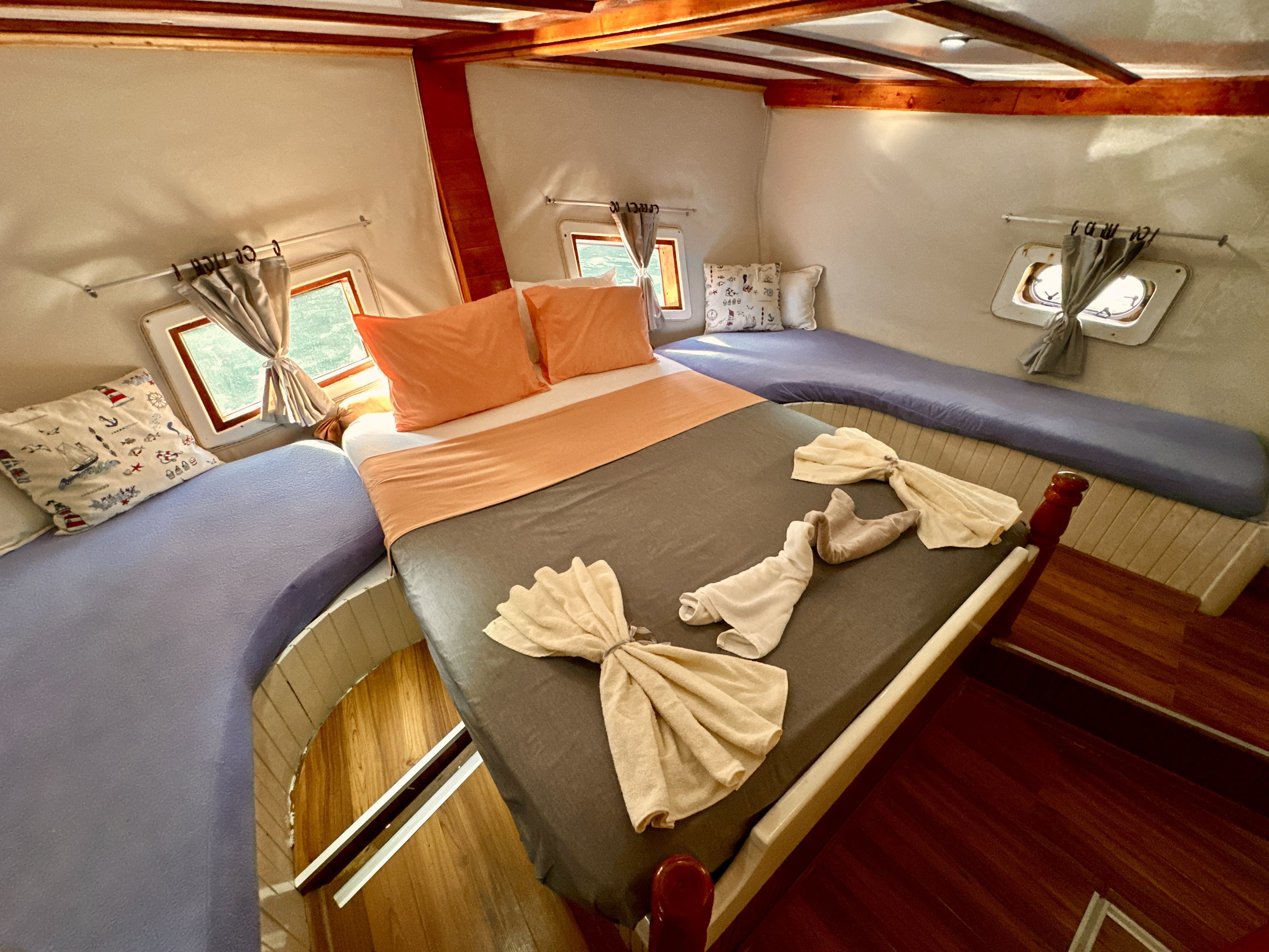 On our boat departing from the port, there are 2 crew members including the captain, the seaman and the cook who will help the guests for a safe blue cruise throughout the tour. During the holiday, the crew will meet the needs of our guests such as safety, food, cleaning and service. The crew cabin at the bow of our boat is in an independent area from the guests.
